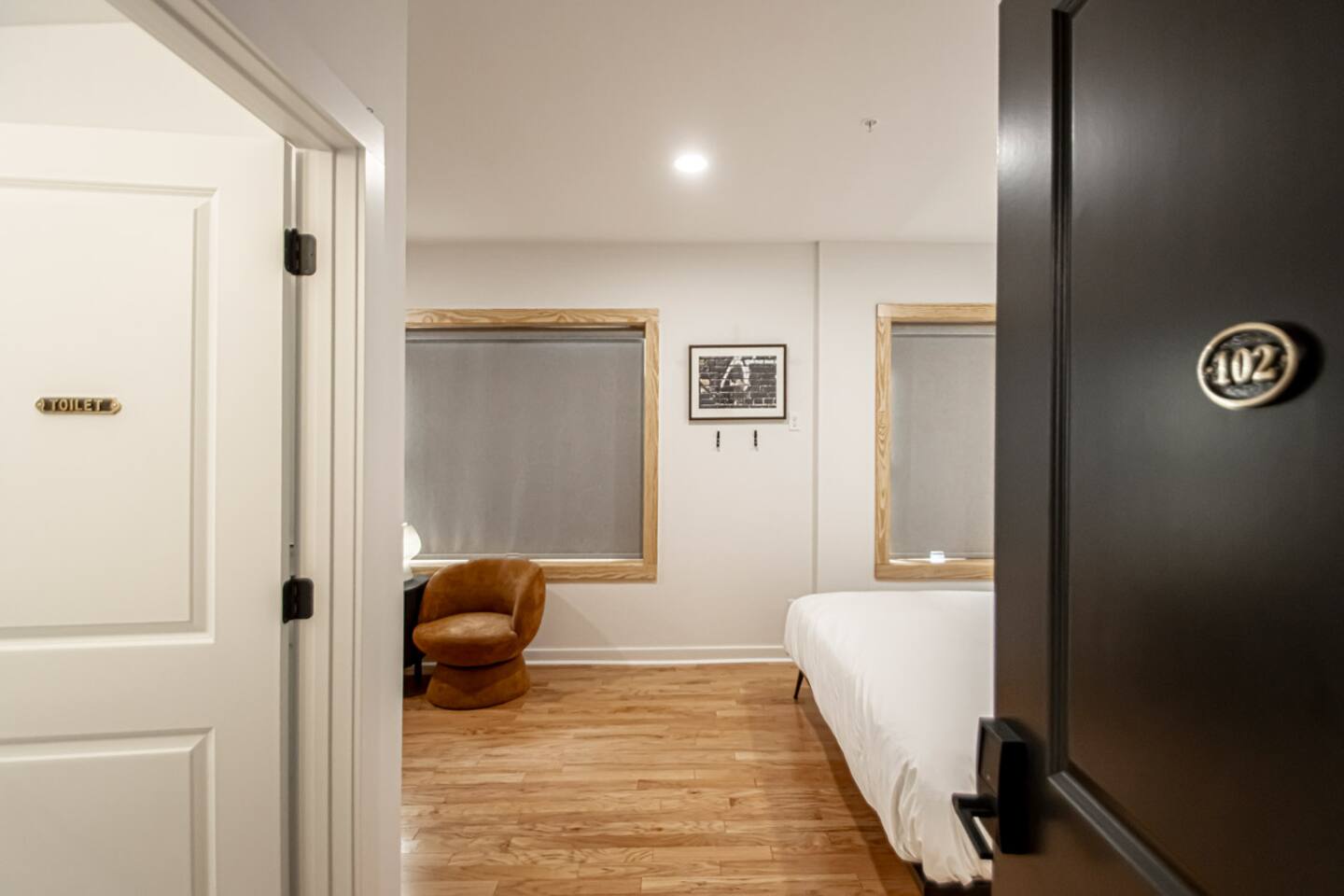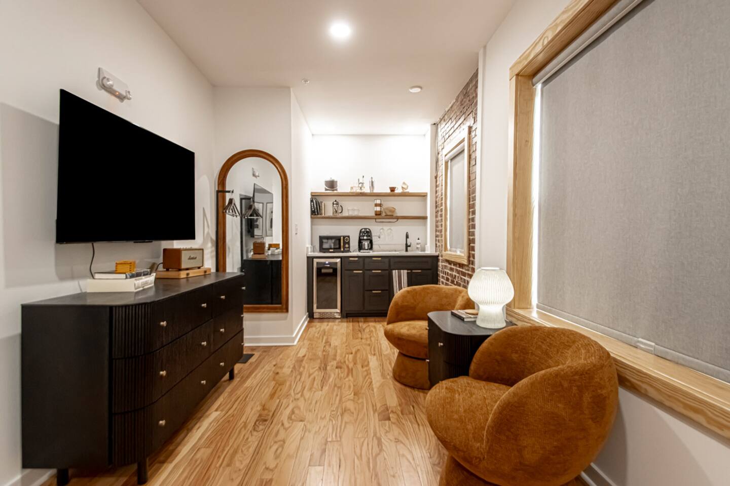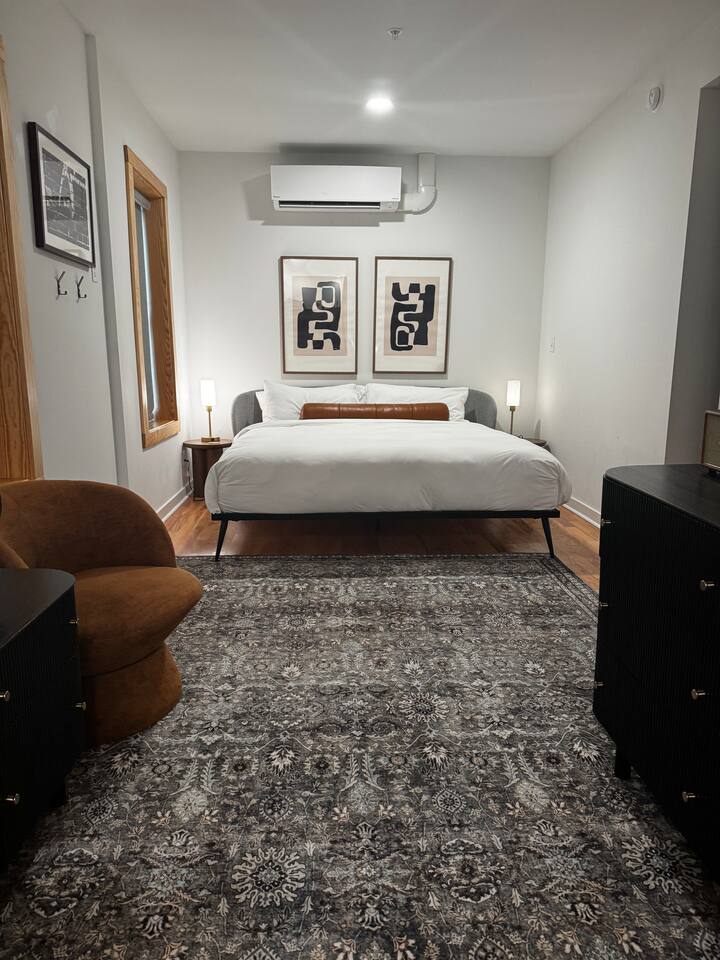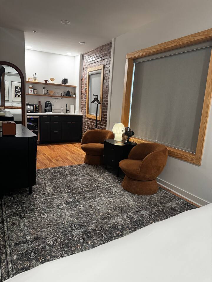 This gorgeous building sits in the heart of historic downtown Hot Springs. Its prime location, slice of history (on the National Register of Historic Places), & elevated style make it the perfect getaway! Walk to Bathhouses, Trails, Restaurants! KEY FEATURES: ☀ King-sized bed w/ high end Centium Satin linens ☀ Kitchenette w/ specialty coffee & cocktail equipment ☀ Shared front and back patio’s w/ fire pits ☀ 55” Roku TV w/ Hulu + Live subscription ☀ Fiber internet